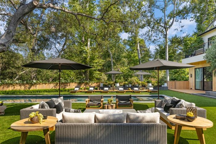 Không gian ngoài trời với bể bơi, sofa thư giãn hoàn thiện căn biệt thự hạng sang ở California.