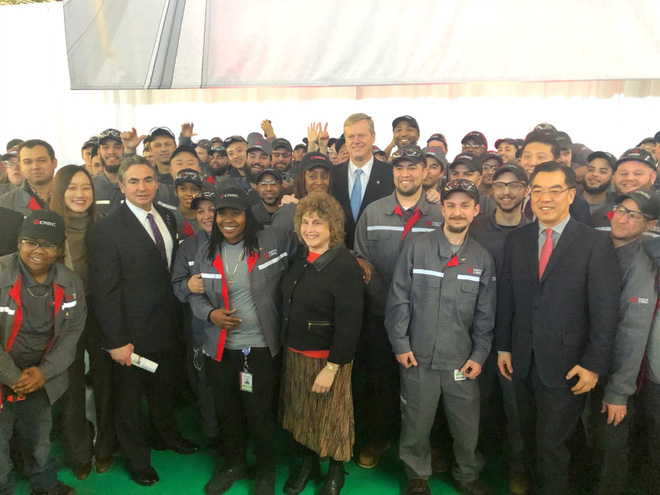Thị trưởng Springfield Domenic J. Sarno (hàng đầu tiên, thứ ba từ trái sang), Thống đốc Massachusetts Charlie Baker (giữa, đeo cà vạt xanh), Bộ trưởng Giao thông Vận tải Massachusetts Stephanie Pollack (hàng đầu tiên, thứ tư từ phải) và Tổng lãnh sự Trung Quốc tại New York Huang Ping (thứ hai từ phải) chụp ảnh chung với các công nhân tại nhà máy của CRRC ở Springfield, Massachusetts.