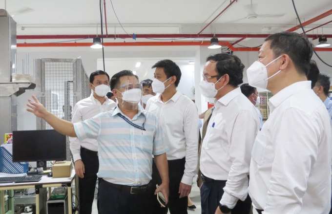 Bí thứ Thành uỷ Nguyễn Văn Nên (thứ 2 từ phải qua) và Phó chủ tịch UBND thành phố Dương Anh Đức (ngoài cùng bên phải) làm việc với nhà máy ở Khu chế xuất Linh Trung I, chiều 11/11. Ảnh: Lê Tuyết