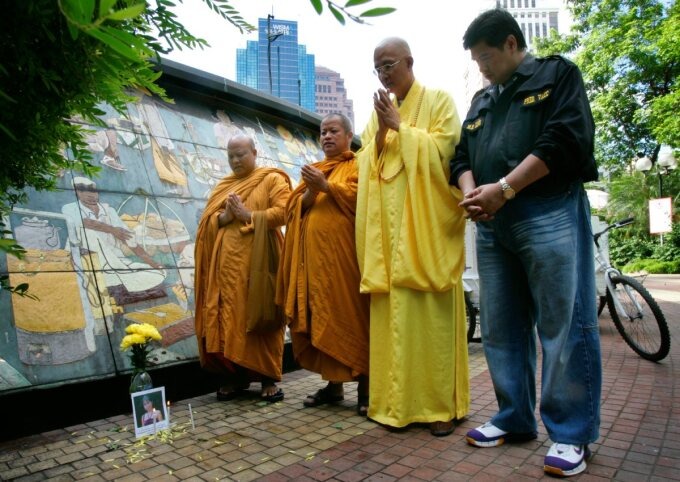 Các nhà sư cầu nguyện cho nạn nhân La Puebla tại đường Orchard, nơi các bộ phận cơ thể cô được tìm thấy. Ảnh: ST File