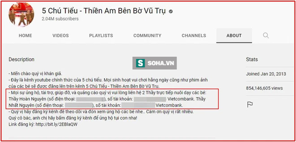 Trong phần mô tả, thông tin này được ghi rõ ràng: "Mọi sự ủng hộ, tài trợ, giúp đỡ, và quảng cáo quý vị vui lòng liên hệ 2 thầy trực tiếp nuôi dạy các bé: Thầy Hoàn Nguyên (số điện thoại xxx), số tài khoản: xxx Vietcombank. Thầy Nhất Nguyên (số điện thoại xxx), số tài khoản: xxx Vietcombank". Bên cạnh đó, kênh này cũng kêu gọi theo dõi để ủng hộ các bé.