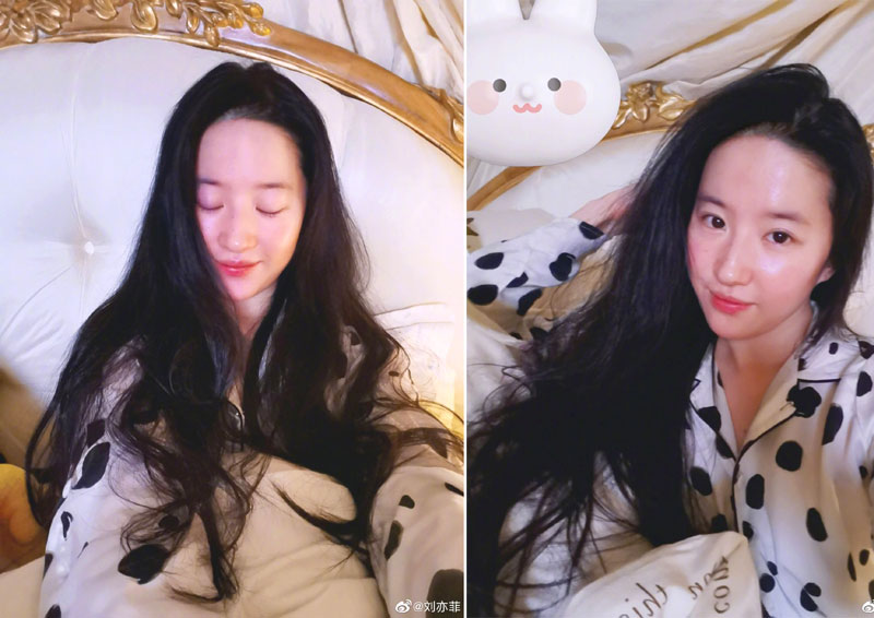 Lưu Diệc Phi diện đồ ngủ, không trang điểm, để mái tóc dài buông tự nhiên. Cô được nhận xét "ăn gian tuổi" vì gương mặt không nếp nhăn, làn da trắng.