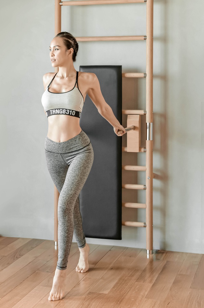 Với hội chứng lưng phẳng, cô không sử dụng tạ nặng mà tập trung bài tập body weight, sử dụng dây kháng lực, bóng hơi… Các động tác giúp tăng sức dẻo dai của cơ thể, đồng thời làm săn chắc phần cơ mặt sau như lưng, mông, đùi sau.