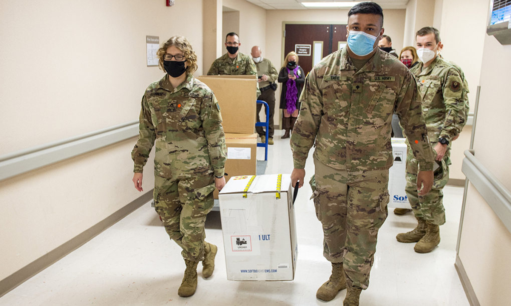 Vệ binh Quốc gia Oklahoma chuyển vaccine Covid-19 ra khỏi kho lưu trữ tại thành phố Oklahoma tháng 12/2020. Ảnh: US Army.