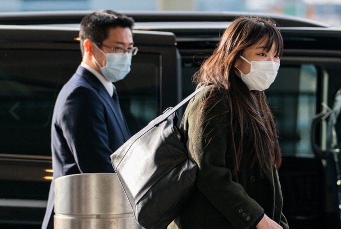 Cựu Công chúa Mako mỉm cười sau lớp khẩu trang, chào những người quan tâm cô ở sân bay quốc tế Kennydy, New York, sáng 14/11. Ảnh: Pool