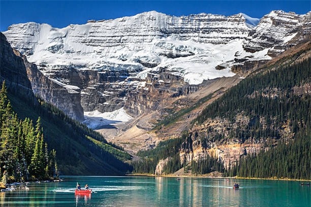 Hồ nước này có nét đẹp thiên nhiên độc đáo, màu nước xanh ngọc bích, bên trên là sông băng Victoria, xung quanh hồ là những ngọn núi hùng vĩ của dãy Rockies, đây là một trong những địa điểm du lịch đẹp nổi tiếng ở Canada.