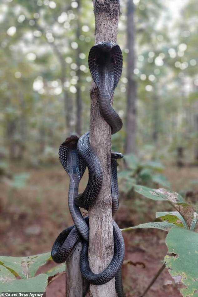 Nilesh chia sẻ: “Tôi bắt được một con rắn trốn trong một căn nhà, một ở chuồng bò và con còn lại trốn trong một túp lều. Ngay khi thả vào rừng, chúng trèo lên cây như vậy”.