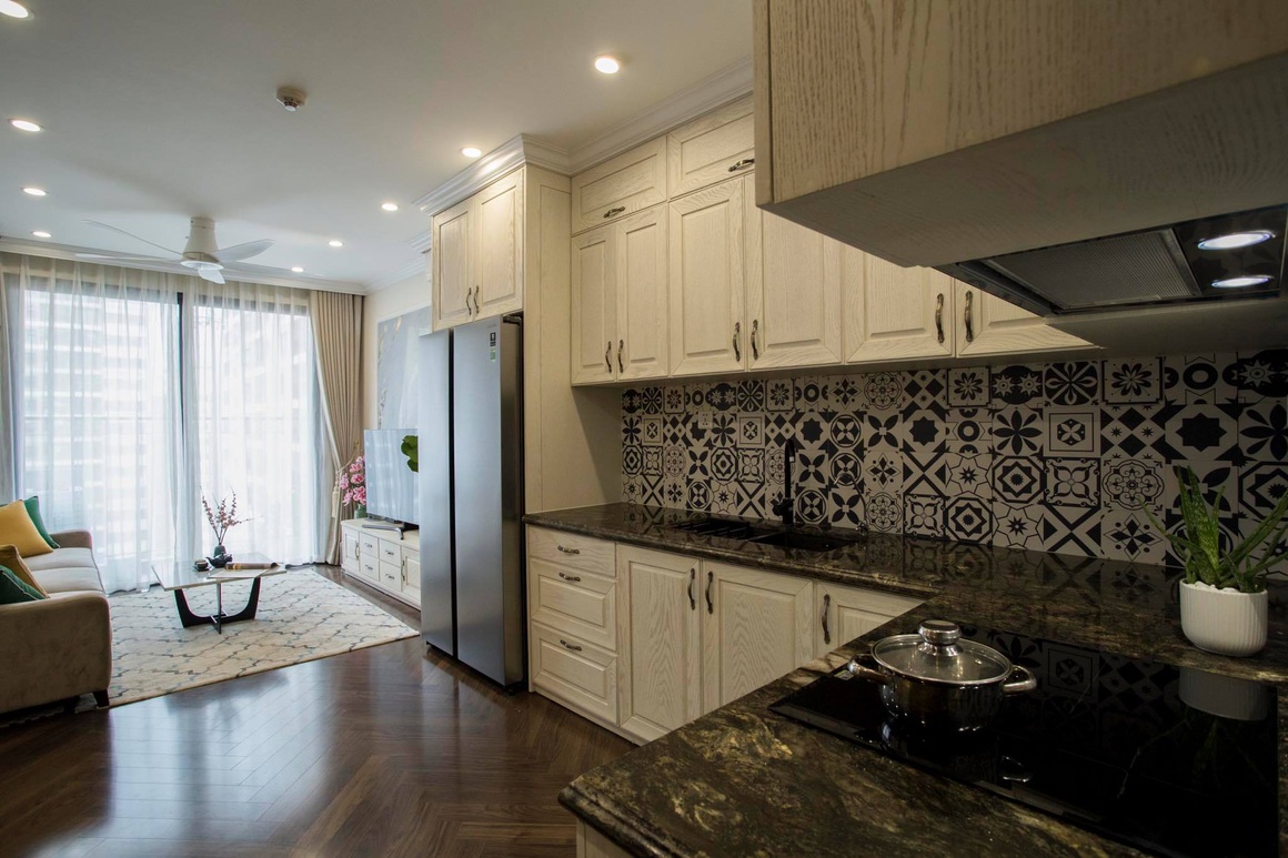 Với tổng chi phí 400 triệu đồng làm nội thất, căn hộ phong cách tân cổ điển của vợ chồng chị Trang tuy nhỏ nhưng khá tinh tế với vật liệu như gỗ tự nhiên, đá nguyên tấm...