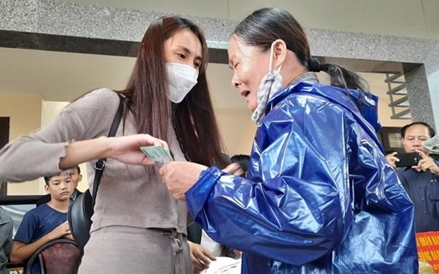 Theo đó, đoàn từ thiện của ca sĩ Thủy Tiên gồm 4 người, đi thuyền đến xóm Xáo để trao quà hỗ trợ. Xóm Xáo có 13 hộ dân thì hơn một nửa được đoàn trao hỗ trợ, có người được trao đến 23 triệu đồng, người thì 5-10 triệu đồng.