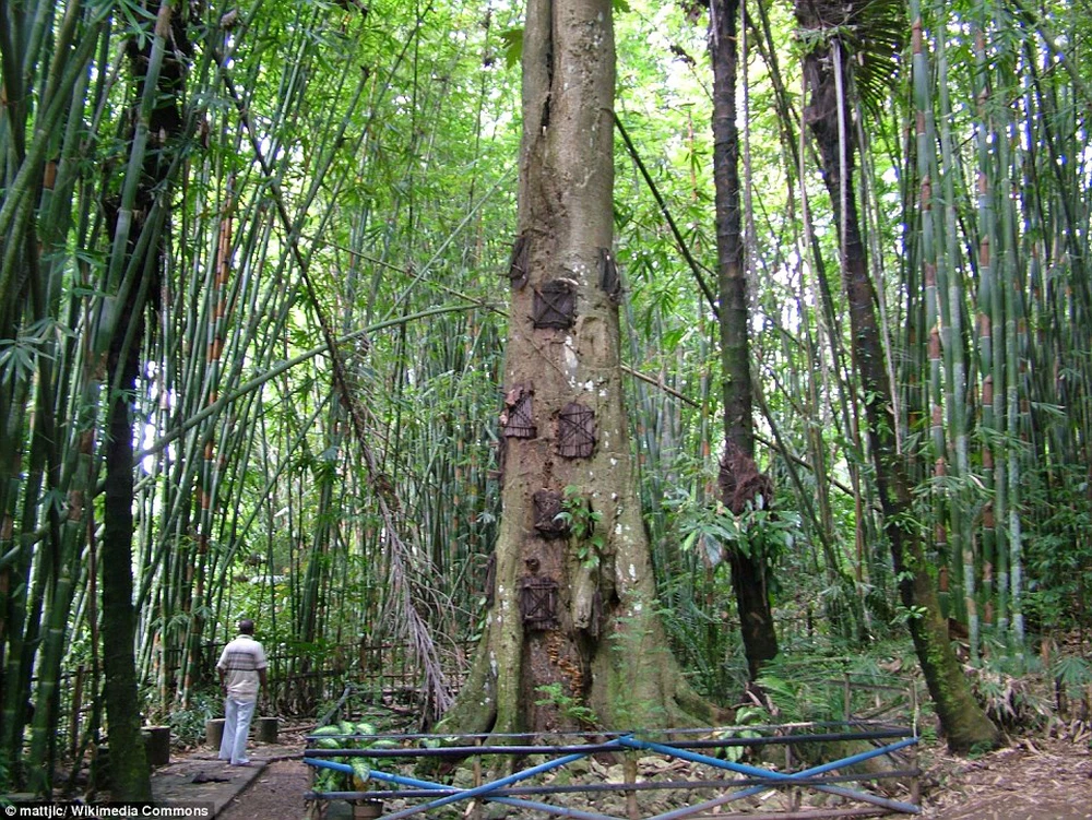 Dân làng ở đây khoét các lỗ trên thân cây to, quấn đứa trẻ đã mất bằng vải rồi sau đó đặt đứa trẻ vào bên trong.