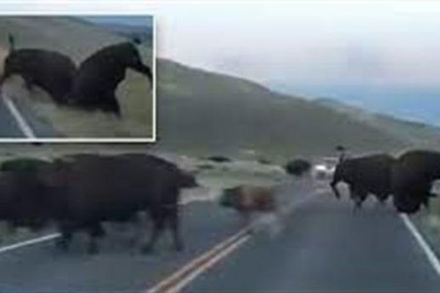 Khi đó, ngay trên đường ô tô những con bò rừng đã xảy ra va chạm. Một con bò rừng lao nhanh về phía đồng loại trước khi tấn công, húc tung nó ra khỏi đường đi sang bên vệ cỏ.