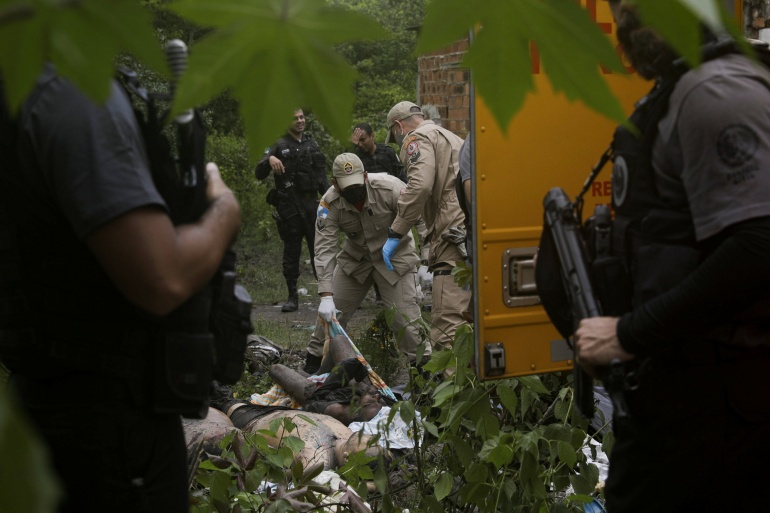 Cảnh sát đứng gác khi lính cứu hỏa thi dọn các thi thể đươc tìm thấy trong đầm lầy ngập mặn ở ngoại ô Rio de Janeiro , sau một cuộc đấu súng dữ dội hôm 22/11. Ảnh Zljazeera