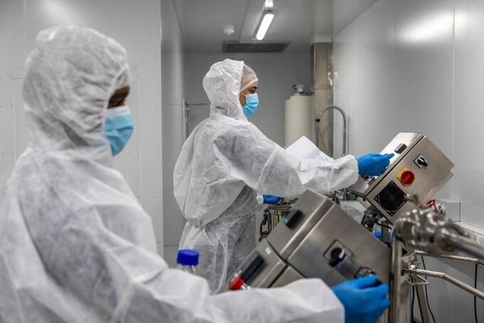 Chuyên viên làm việc tại cơ sở sản xuất vaccine Afrigen Biologics Limited ở Cape Town, ngày 12/7. Ảnh: Bloomberg