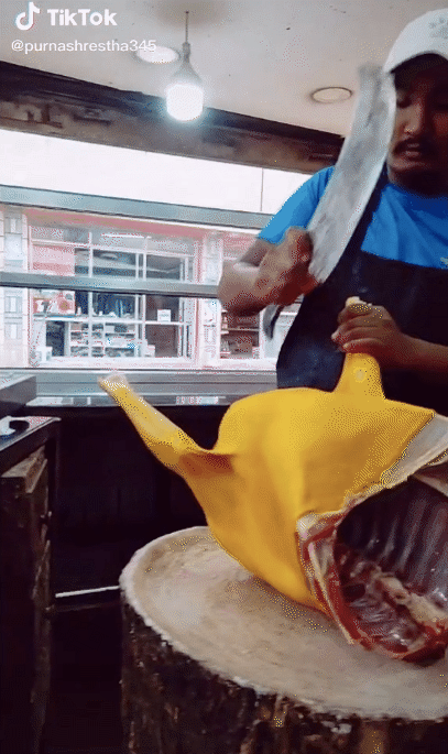 Nhiều người không khỏi ngỡ ngàng khi chứng kiến cảnh một người đàn ông nước ngoài chặt thịt loài vật nào đó trên thớt.