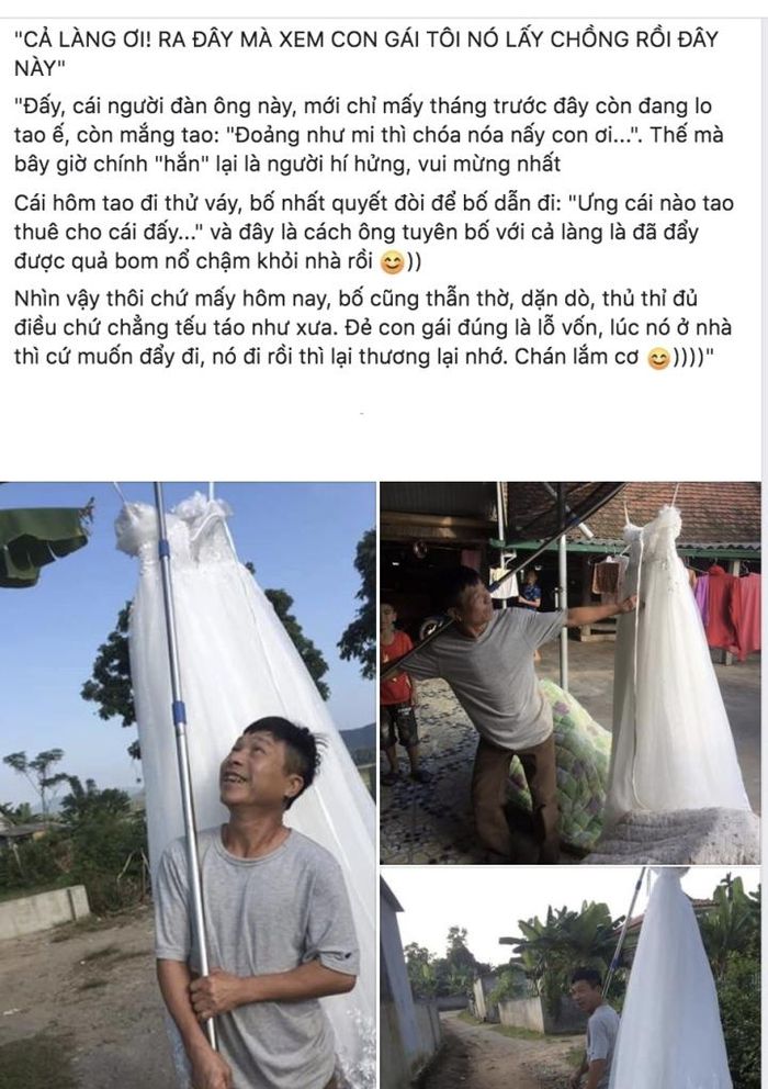 Bài chia sẻ của cô gái về việc bố mình hí hửng, vui mừng khi cô mãi mới 'thoát ế' khiến dân tình không nhịn được cười. Khi biết con gái sắp lấy chồng, ông bố này không chỉ đòi dẫn đi chọn váy cưới cùng mà còn chẳng ngần ngại treo váy cưới lên chiếc gậy rồi vác đi quanh xóm để khoe niềm vui với mọi người.