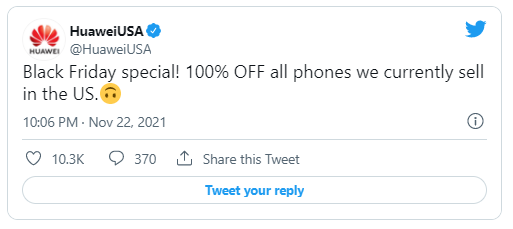 Trên tài khoản Twitter chính thức của Huawei ở Mỹ đã đăng thông báo: "Đặc biệt ngày Black Friday, chúng tôi sẽ sale 100% các sản phẩm điện thoại mà chúng tôi đang bán ở Mỹ."