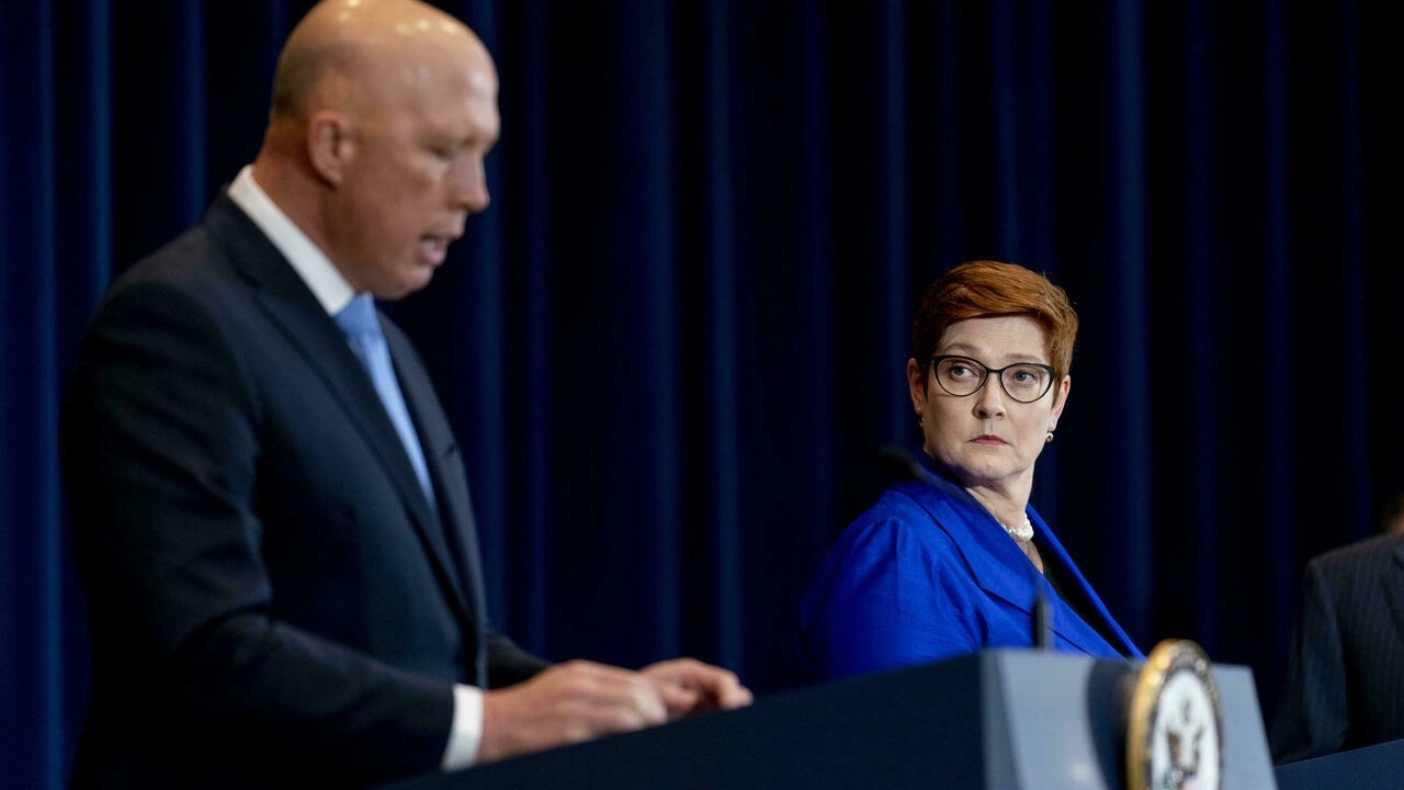 Bộ trưởng Quốc Phòng Úc Peter Dutton (T) và ngoại trưởng Úc Marise Payne trong cuộc họp báo chung với các đồng nhiệm Mỹ tại trụ sở bộ Ngoại Giao Hoa Kỳ, Washington DC, ngày 16/09/2021. © ap