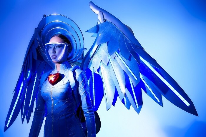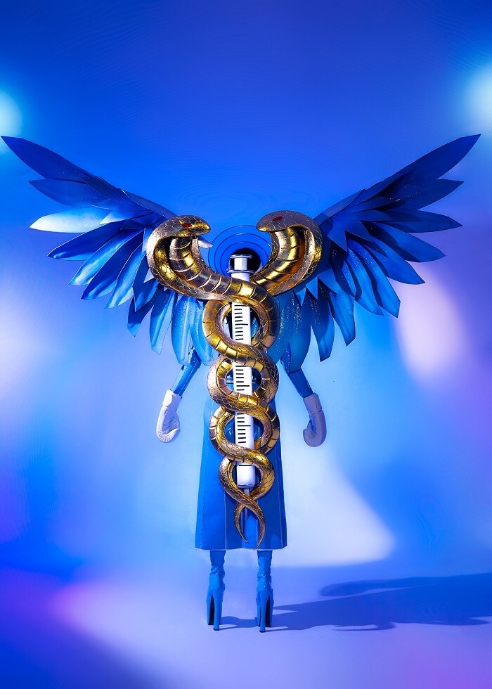 Bộ trang phục có sắc xanh chủ đạo, được lấy cảm hứng từ màu áo bảo hộ của lực lượng chống dịch. Phía sau là phần cách điệu đôi rắn mạ vàng và điêu khắc thủ công quấn quanh ống tiêm vaccine cùng với đôi cánh sơn hiệu ứng ombre ánh kim, tạo nên hình ảnh biểu trưng của ngành y.
