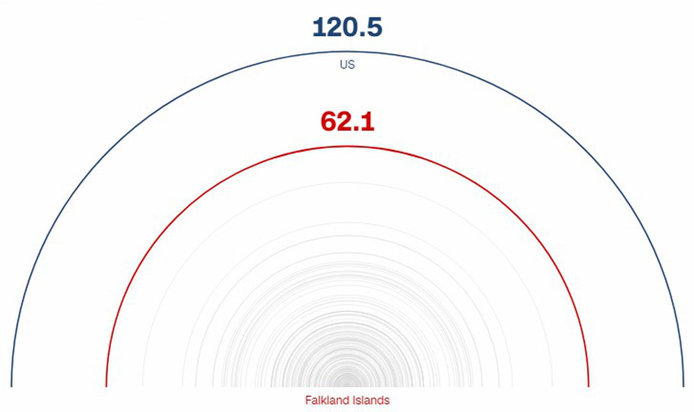 So sánh cho thấy sự chênh lệch lớn về tỷ lệ sở hữu súng tại Mỹ và Quần đảo Falkland- nơi có kho vũ khí cá nhân tính theo đầu người lớn thứ hai thế giới. Ảnh: CNN.