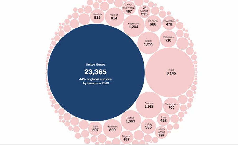 Mỹ là nơi sinh sống của 4% dân số thế giới nhưng chiếm tới 44% số vụ tự sát bằng súng vào năm 2019. Nước này ghi nhận số vụ tự tử liên quan đến súng nhiều nhất trên thế giới hàng năm từ 1990 đến 2019.