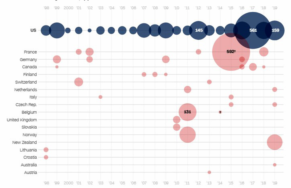 Một nửa các quốc gia phát triển trên thế giới đã có ít nhất một vụ xả súng công khai từ năm 1998 đến năm 2019. Nhưng không quốc gia nào khác chứng kiến nhiều hơn 8 vụ trong 22 năm, trong khi Mỹ có hơn 100 vụ, với gần 2.000 người thiệt mạng hoặc bị thương.