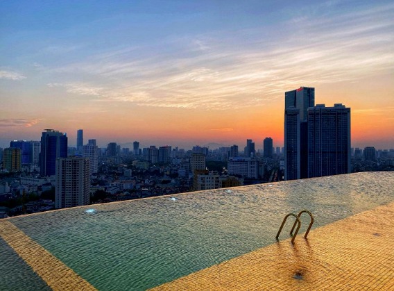 Bể bơi vô cực được dát vàng, view nhìn ra toàn cảnh thành phố. Ảnh: Khu nghỉ dưỡng