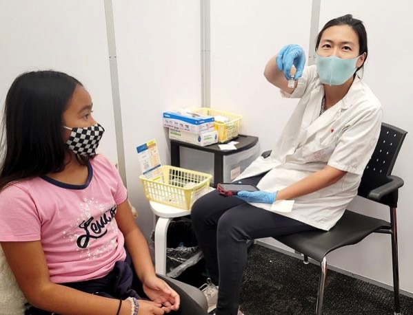 Anh Dũng nói:"Cả nhà đã hoàn thành trách nhiệm bảo vệ sức khỏe cộng đồng. Trẻ em từ 5 -11 tuổi được tiêm 1/3 liều lượng Pfizer của người lớn. Trước khi tiêm, Y tá đưa thuốc cho bố mẹ kiểm tra, sau khi tiêm, mỗi cháu được một món quà. Trẻ em từ 5-11 tuổi đã được FDA chứng nhận cho tiêm từ ngày 4 tháng 11, 2021, liều một và liều hai cách nhau bốn tuần."