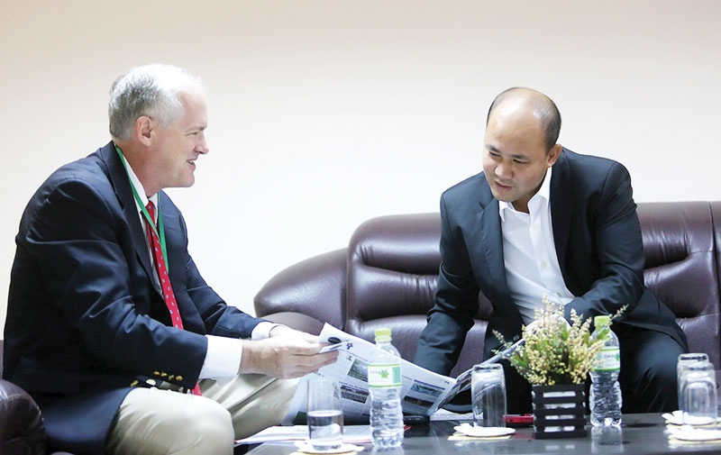 Hun Many (phải), con trai út của Thủ tướng Hun Sen, trả lời phỏng vấn vào năm 2014 sau khi đắc cử đại biểu quốc hội Campuchia. Ảnh: Khmer Times.
