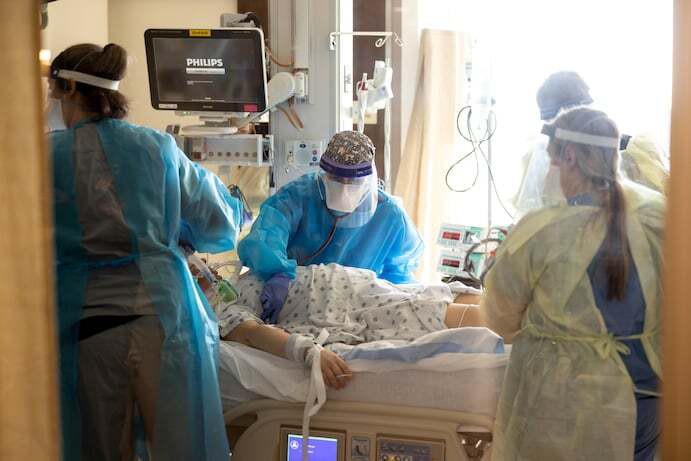 Một nhóm y bác sĩ đang điều trị bệnh nhân trong khu điều trị tích cực ở Bệnh viện St. Cloud, Minnesota, Mỹ. Ảnh: Washington Post.