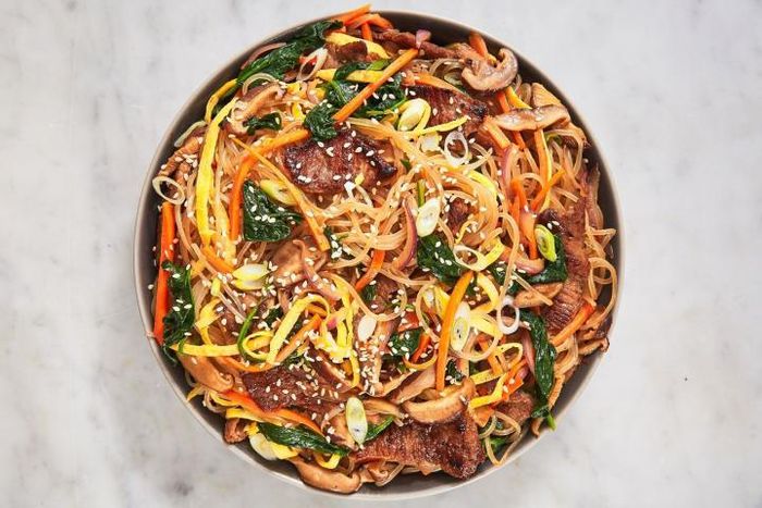 Đây là một món mì sợi làm từ tinh bột khoai lang. Sợi mì có độ trong suốt nhất định. Mì được xào với các gia vị để có độ mặn ngọt vừa phải. Dù được sử dụng như một món ăn kèm (một dạng panchan) nhưng japchae lại rất nổi tiếng bởi hương vị thơm ngon.