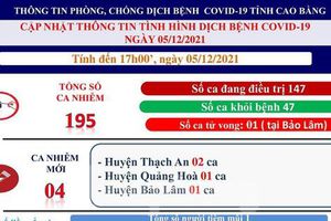 Theo báo cáo của Trung tâm kiểm soát bệnh tật tỉnh Cao Bằng, tính đến 17h00 ngày 5/12, toàn tỉnh Cao Bằng ghi nhận 195 ca mắc COVID-19. Riêng ngày 5/12, có 4 ca nhiễm mới ở huyện Thạch An, Quảng Hòa.