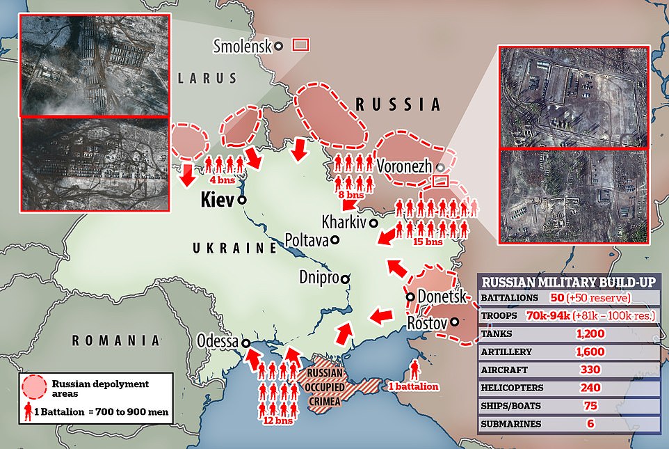 Hình ảnh mới củng cố quan điểm của tình báo Mỹ, rằng Nga có 50 tiểu đoàn sẵn sàng chiến đấu ở biên giới, với 50 tiểu đoàn khác đóng vai trò dự bị, tổng cộng tên tới 175.000 quân.