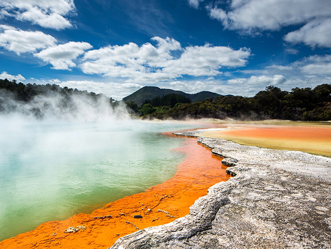 Hồ bơi Champagne, Waiotapu, New Zealand: Đây là một trong những điểm tham quan mang nhiều màu sắc nhất ở Waiotapu. Con suối lớn chứa một lượng lớn khí carbon dioxide khiến nhiệt độ có thể đạt đến khoảng 74 độ C nên du khách không thể bơi trong đó. Nhưng bạn sẽ được thưởng thức vẻ đẹp đầy màu sắc rực rỡ của hồ bơi.