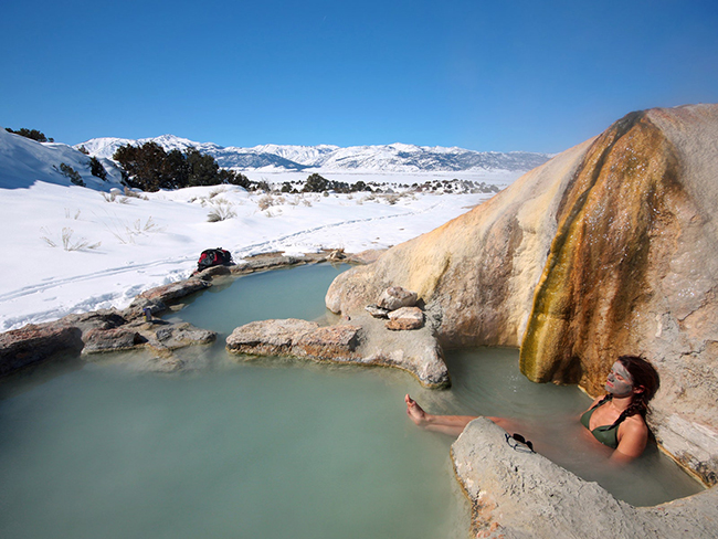 Suối nước nóng Travertine, Đông Sierras, California: Các hồ bơi ở đây được hình thành bởi những giọt nước nóng nhỏ xuống đá travertine và tảo trong nhiều thế kỷ và lắng ở nhiệt độ 40-41 độ C. Thư giãn ở những bồn tắm nước nóng tự nhiên này, bạn sẽ có tầm nhìn bao quát khắp xung quanh và ngắm cảnh hoàng hôn tuyệt đẹp.