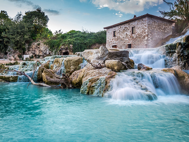 Terme di Saturnia, Tuscany, Ý: Thác nước Cascate del Mulino và spa nước nóng thiên nhiên Terme di Saturnia là những điểm tham quan nổi tiếng ở miền nam Tuscany. Các thác nước nóng chảy vào đá travertine trong nhiều thế kỷ tạo thành các "hồ bơi" nhỏ tuyệt đẹp.