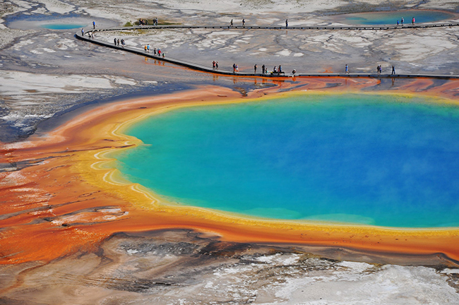 Grand Prismatic Spring, Wyoming: Đây là suối nước nóng lớn nhất ở Yellowstone và lớn thứ ba trên toàn thế giới. Trung tâm của hồ bơi có màu xanh lam (và ở nhiệt độ khoảng 87 độ C), được bao quanh bởi các vòng màu từ xanh lá cây đến cam, một hiệu ứng tạo ra bởi vi khuẩn phát triển mạnh trong vùng nước ấm và giàu khoáng chất .