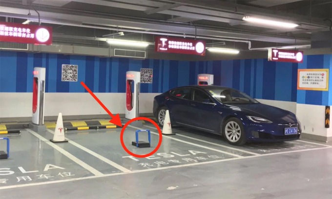 Khóa sàn tại một trạm sạc Supercharger của Tesla tại Trung Quốc. Ảnh: Electrek