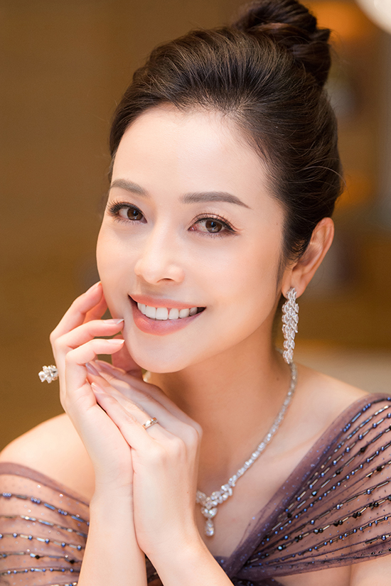 Hoa hậu hoàn thiện vẻ ngoài sang trọng bằng cách kết hợp bộ váy dạ hội với trang sức lấp lánh và kiểu tóc búi cao. Đây là phong cách thường thấy ở Jennifer Phạm mỗi lần dự sự kiện.