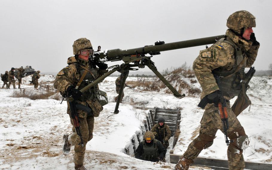 Binh sĩ Ukraine mang theo một khẩu súng trường không giật trong một cuộc tập trận vào tháng 11/2016 gần Yavoriv, Ukraine. Ảnh Elizabeth Tarr/Stripes