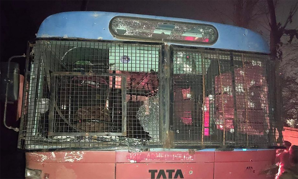 Xe buýt chở cảnh sát Ấn Độ bị phiến quân nã đạn ở thành phố Srinagar ngày 13/12. Ảnh: BBC.