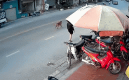 Hậu quả, một chiếc xe máy do không phản ứng kịp đã đâm trúng chú chó, ngã văng ra đường.