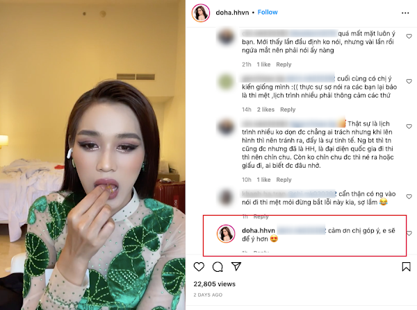 Sau khi đăng tải, ý kiến này nhận được nhiều sự đồng tình của những dân ᴍạɴɢ khác. Họ cũng cho rằng nàng hậu nên cẩn trọng với hình ảnh của mình. Đáp lại những lời nhắc nhở này, Đỗ Thị Hà cũng nhẹ nhàng để lại bình luận tiếp thu và sửa đổi. Đại diện Việt Nam tại Miss World chia sẻ: “Cảm ơn chị góp ý, e sẽ để ý hơn”.