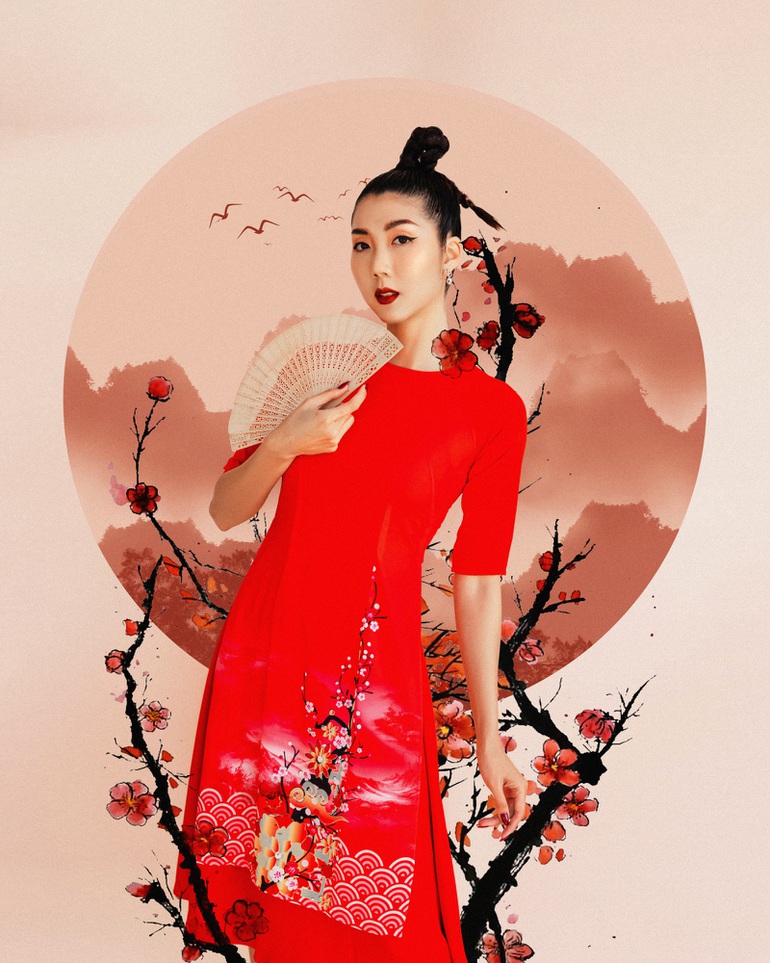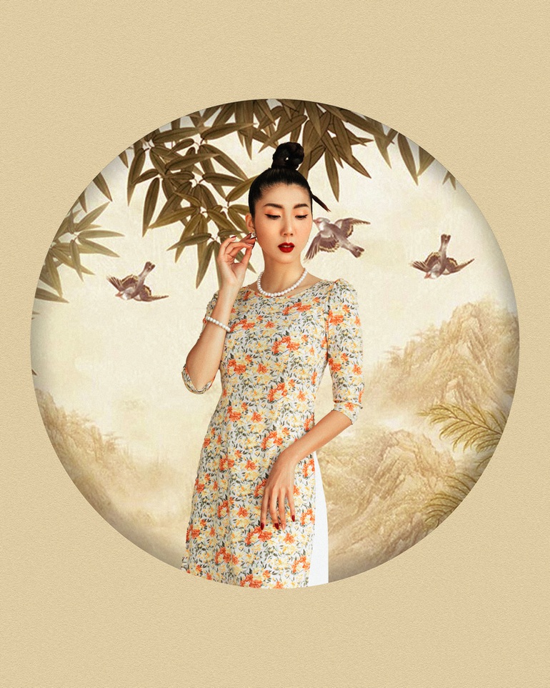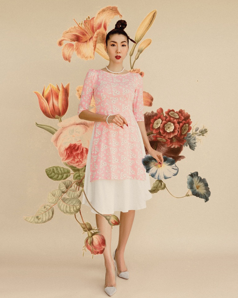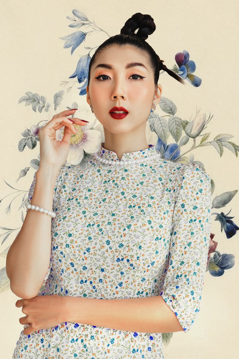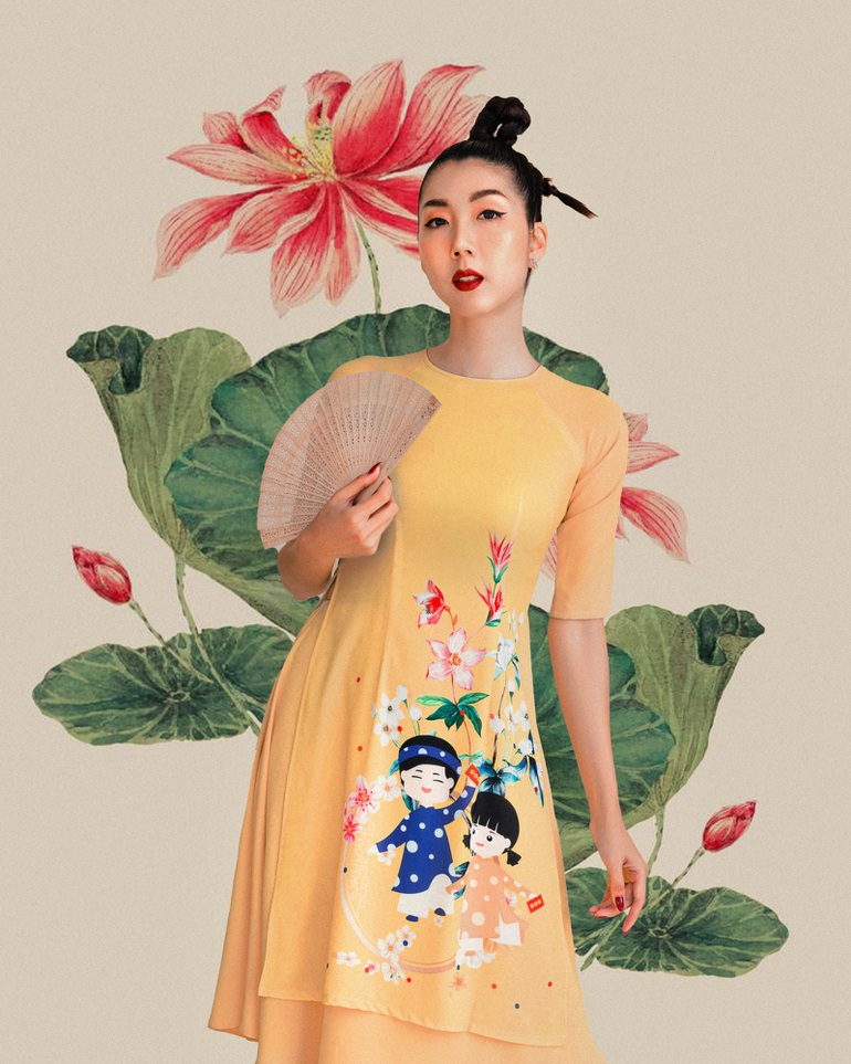 Dịp này, Ngọc Quyên hướng đến sự tinh tế khi lựa chọn chất liệu tôn dáng, hình in lấy cảm hứng từ những bức tranh dân gian và cách cắt may tỉ mỉ. Cô mong muốn gửi gắm tinh thần dân tộc qua món trang phục truyền thống cho những người hiện sống và làm việc ở nước ngoài.