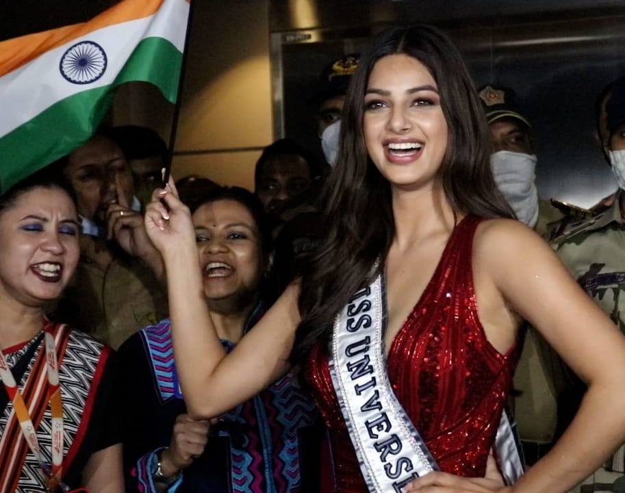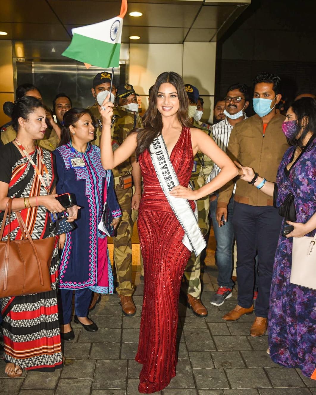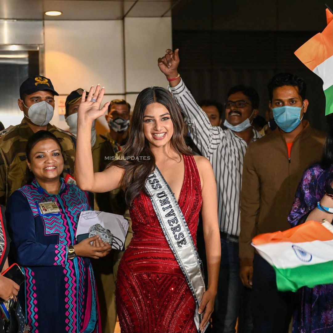 Tại sân bay, Harnaaz cùng tất cả mọi người hô vang khẩu hiệu: "India, India", thể hiện niềm tự hào với chiến thắng lịch sử ấn tượng tại đấu trường sắc đẹp danh giá