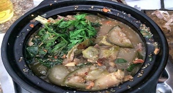Đây là một món ngon có nguồn gốc từ dân tộc Ê Đê, cây cà đắng là một loại cây mọc dại lớn hơn cà pháo có màu xanh trắng, cây có nhiều gai nhọn, cây này thường được hái trên rẫy. Họ thường sử dụng cà này để làm thực phẩm hàng ngày, tạo thành các món ngon như cà đắng xào, cà đắng om ếch, cà đắng kho, canh cà đắng.