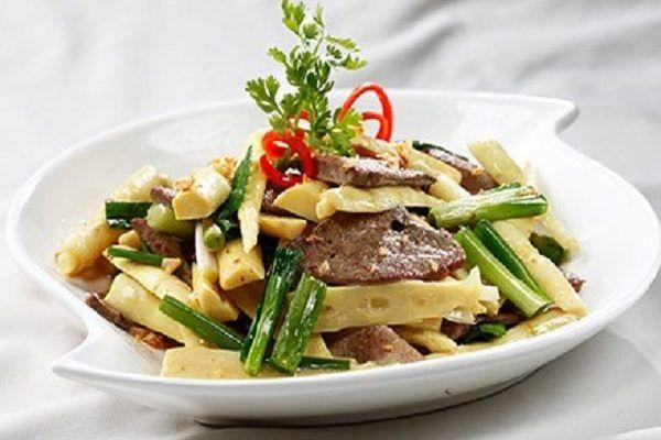 Những bắp măng tre tươi được nướng trên lửa than hồng thơm nức mũi, sau đó được rửa sạch và thái nhỏ, rồi đem xào chung với phèo non và phổi bò, lòng bò, được thêm gia vị và củ nén và ớt tăng thêm độ cay nồng của món ăn, vị ngọt của măng tre rừng và vị bùi đắng của lòng bò làm du khách khi thưởng thức món ăn này đều ngất ngây.