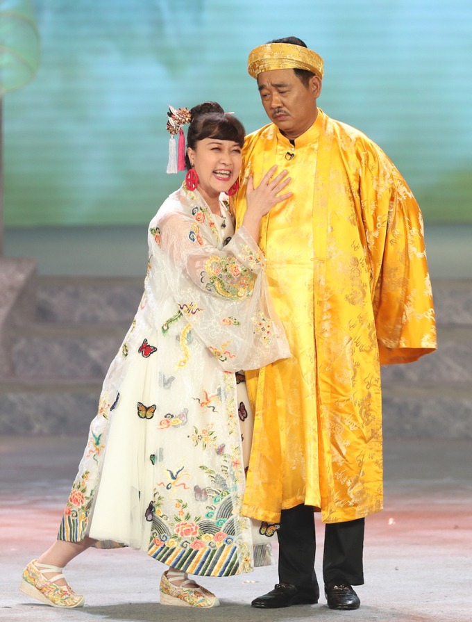 Vân Dung (vai Táo Y tế) và Quốc Khánh (vai Ngọc Hoàng) trong Táo quân 2021. Ảnh: VFC