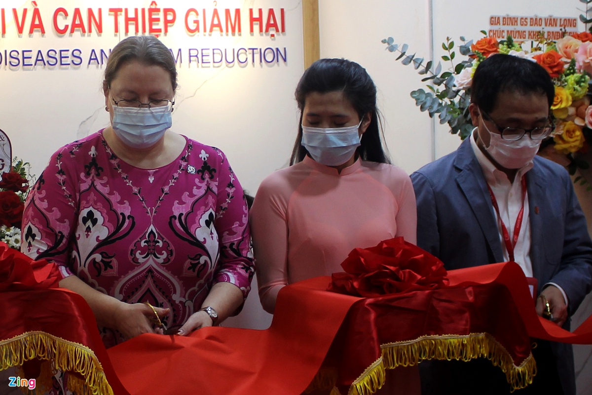 “Buổi lễ ra mắt (của khoa DTDHR) hôm nay là biểu tượng cho sự hỗ trợ của chúng tôi nhằm ngăn ngừa lây nhiễm HIV và đảm bảo người nhiễm HIV có cuộc sống khỏe mạnh và an toàn”, bà Damour trả lời Zing. Trong ảnh, Đại biện Damour tham gia cắt băng khai trương.