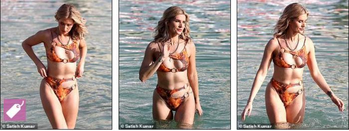 Ngôi sao sân khấu ở xứ sở sương mù mặc bộ áo tắm họa tiết tông màu đỏ cam, cắt xẻ táo bạo, khoe tối đa hình thể săn chắc và nóng bỏng.