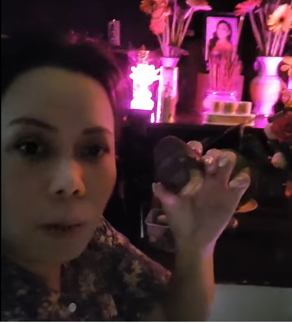 Tiếp đó, Việt Hương giới thiệu với khán giả bàn thờ ca sĩ Phi Nhung trong hậu trường sân khấu. Cô nói: